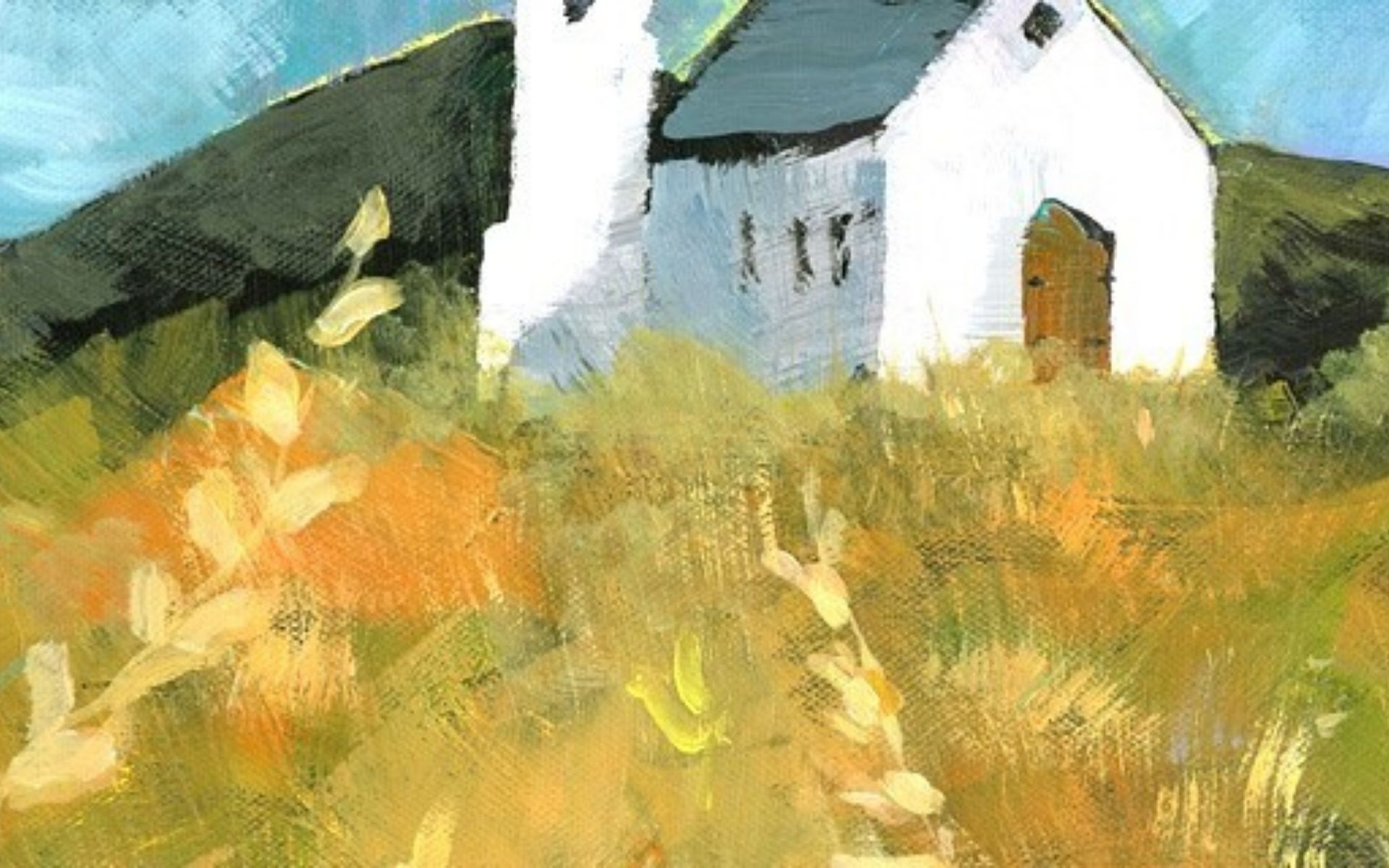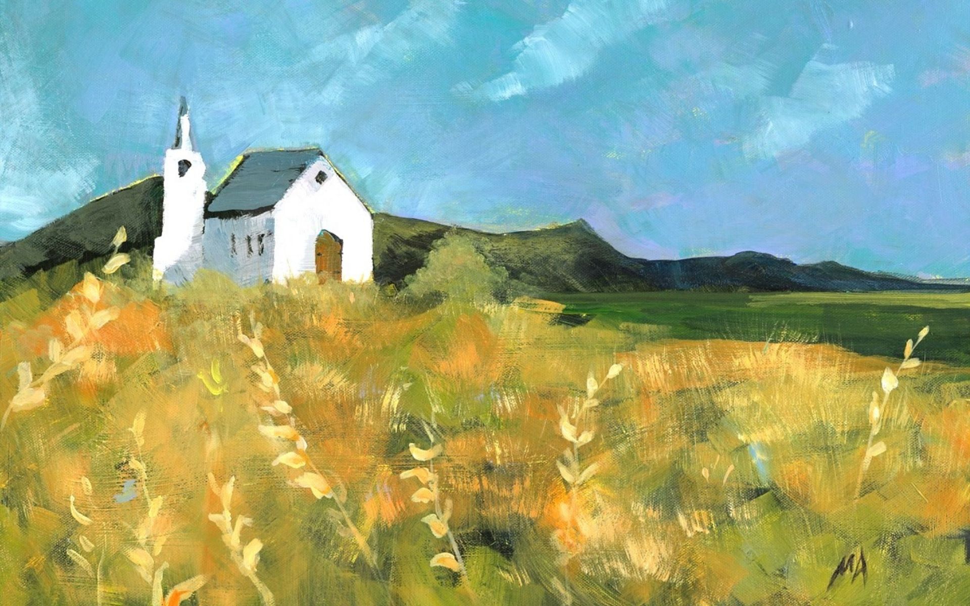 Chapel on the Hill is a simple, light-filled ode to love and place. Painted through the golden glow of summer grasses and seed heads, it reflects a moment of stillness — a pause before arrival — where landscape, memory, and meaning quietly meet.