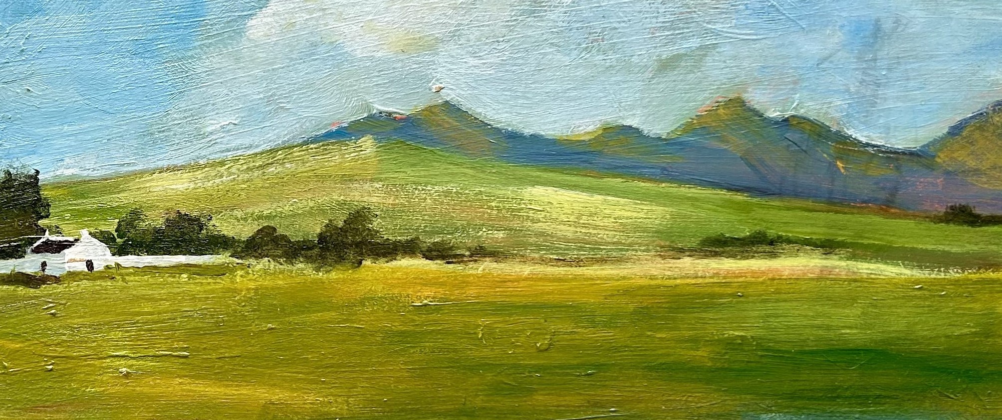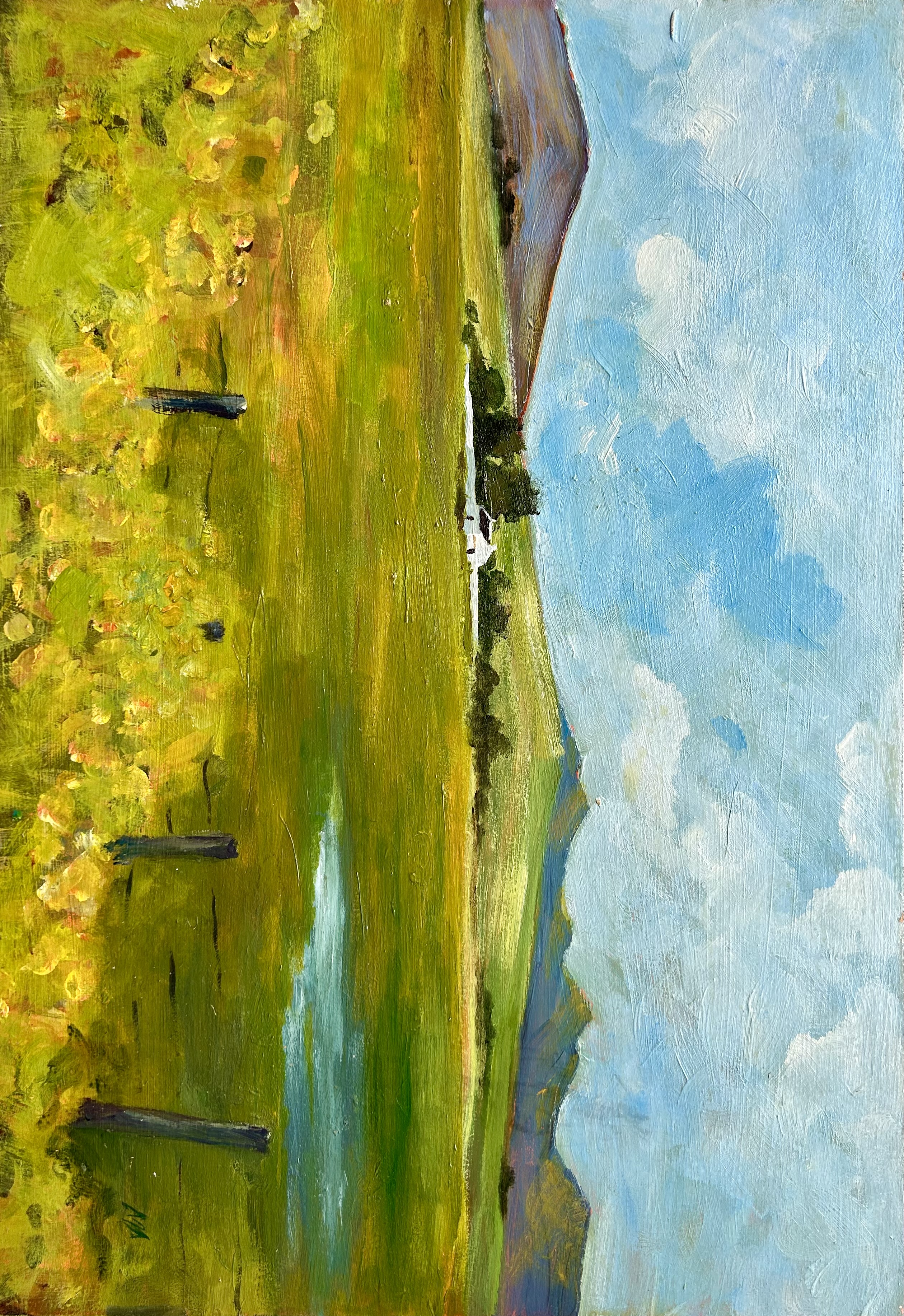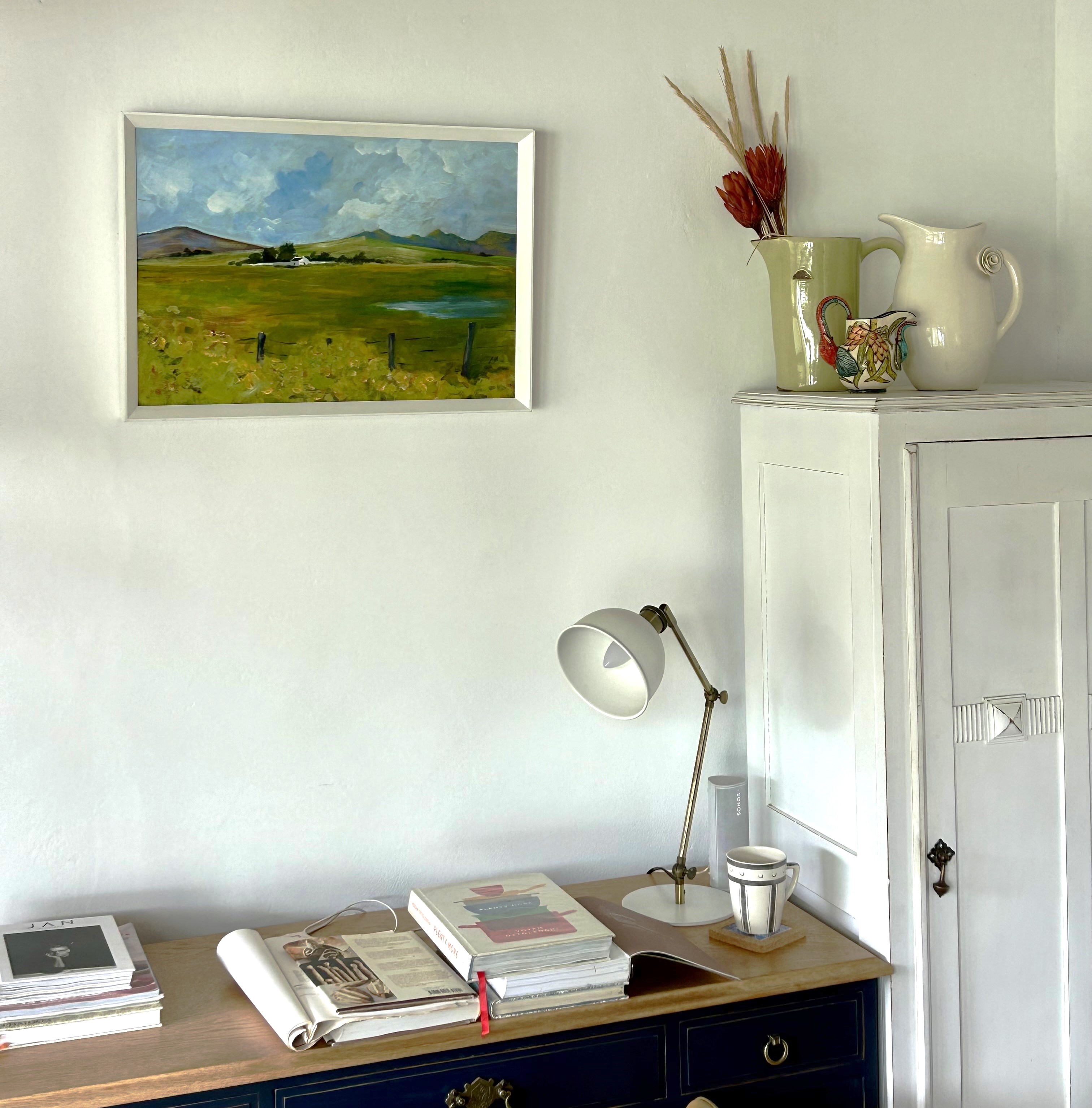 Painted in layered acrylics on hardboard, the work reflects a homestead amidst the expansive calm of the Swartland: wide fields, distant hills, and a sky that refuses to settle. The light is not dramatic, but patient — moving slowly across grass and water, revealing colour in stages.