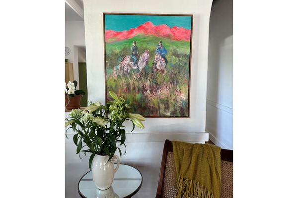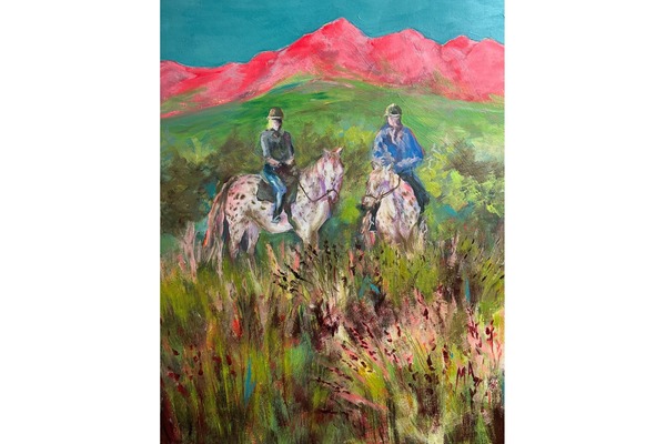 Painted in acrylic on board, the work reflects Flanagan’s ongoing exploration of companionship, shared journeys, and quiet forms of love—expressed through colour, movement, and land rather than portrait detail.
